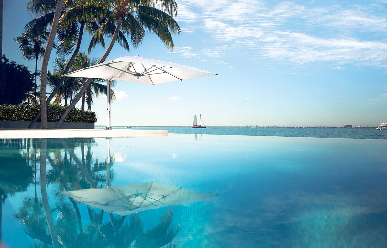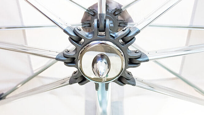 The ocean master MAX cantilever is simply art and engineering harmonizing in a symphony of shade. The polished and anodized marine-grade canopy structure cantilevers from a sturdy, oval shaped mast inspired by sailing yachts. And with the combined features of an ultra strong aluminum milled fulcrum and automatic telescoping mast, the canopy of this side post umbrella easily closes over tables and chairs. With remote.