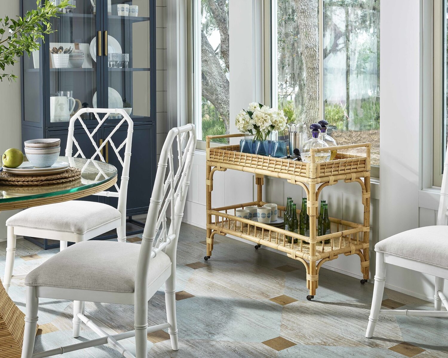 Coastal cocktails coming right up! Celebrate and relax with the 5 O’Clock Bar Cart featuring a rattan, double-tiered body and casters for added convenience.Dimensions: 38W X 18D X 33H