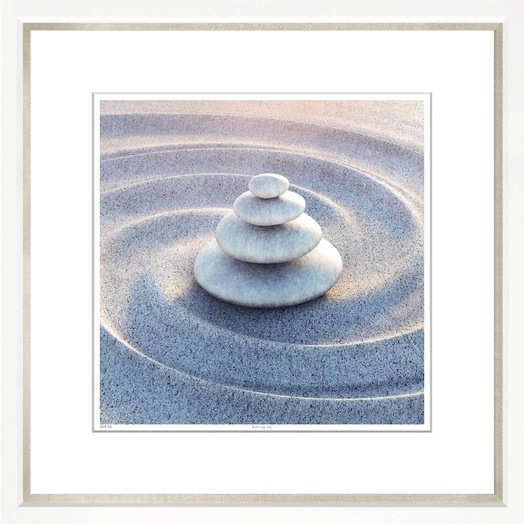 A Japanese Zen garden with carefully balanced stones and raked sand.Dimensions: 19″ L x 19″ H available to order in additional sizes