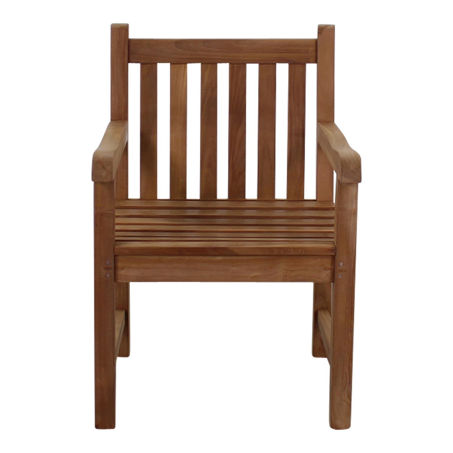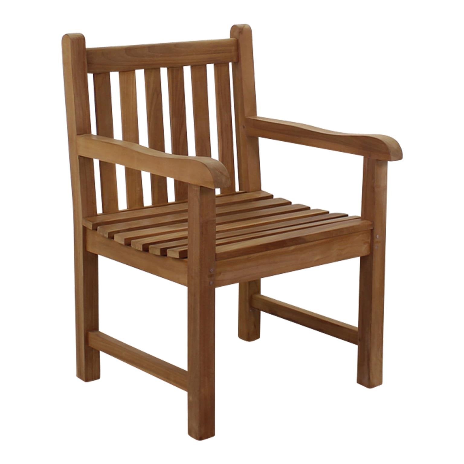 This simple solid teak chair is perfectly suited to be coupled with a side table or bench in the garden, or alongside a dining table on the patio.