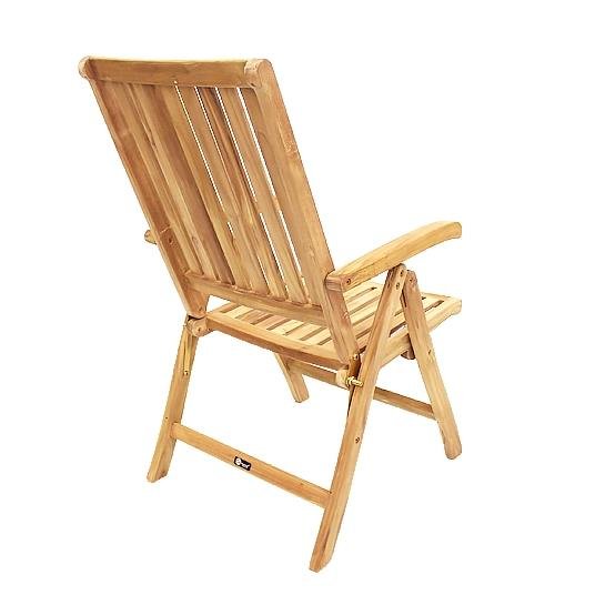 This teak high-back reclining armchair may be utilized as a comfortable seat at the head of the table, or as accessory seating on a deck or balcony. It readily folds for storage and transport.
