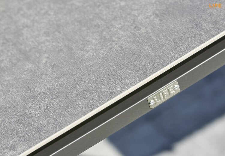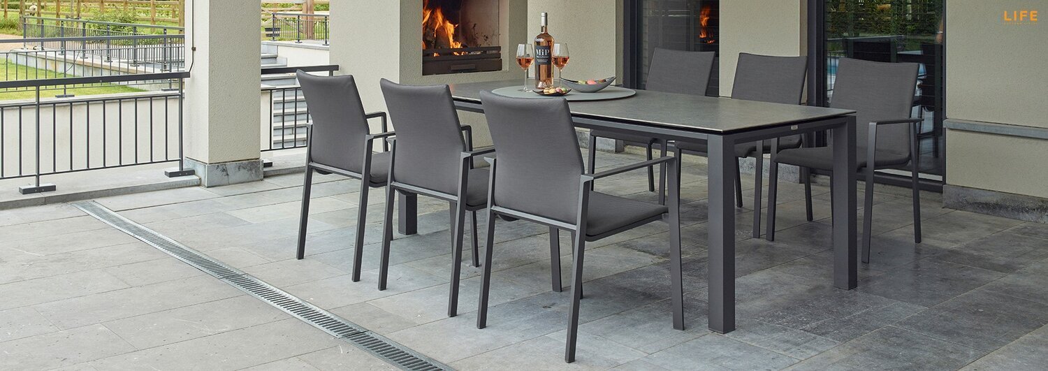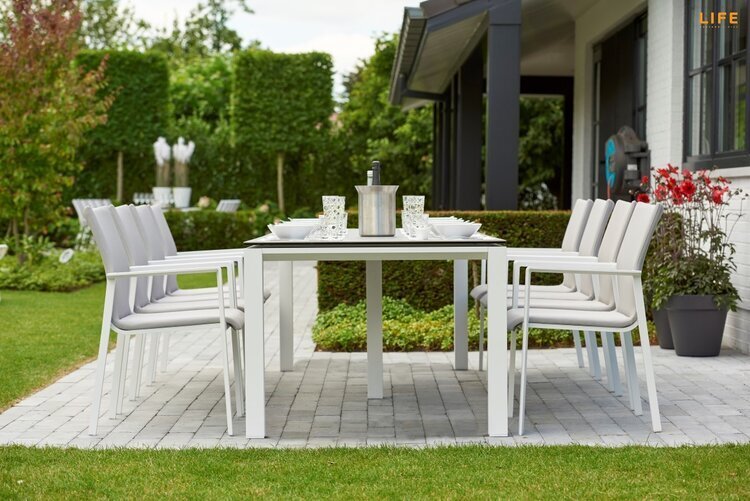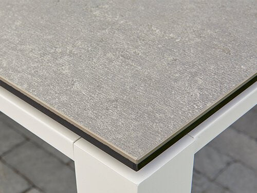 Durable aluminum frame construction. This version of the Ceramic table top creates a light and modern look, 2-3 layers of sprayed material are used on top of a shatterproof glass plate. The unique Ceramic table tops have remarkable strength. Ceramic is one of the hardest materials used in garden furniture. It has an extremely high scratch threshold, it is UV proof, colorfast and it is easy to maintain.