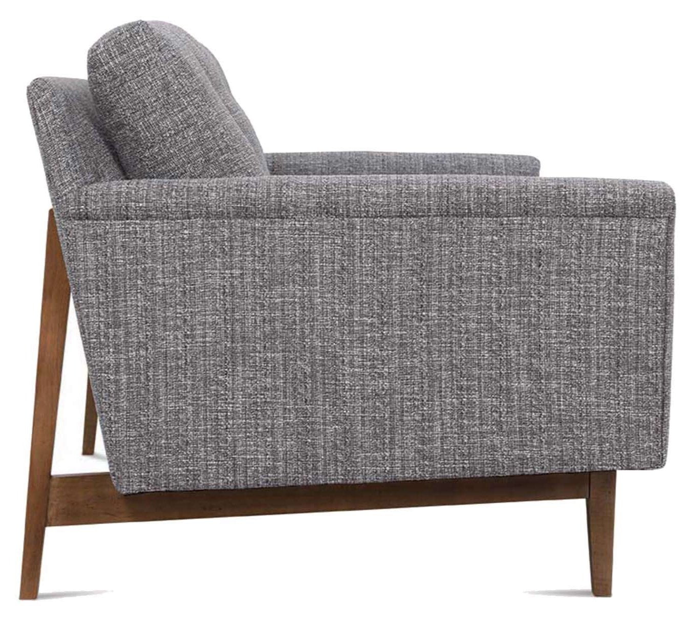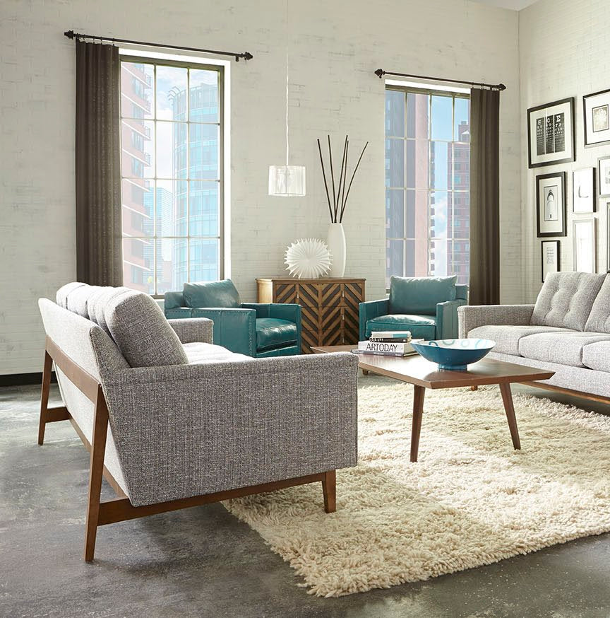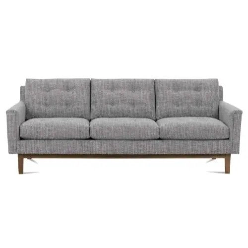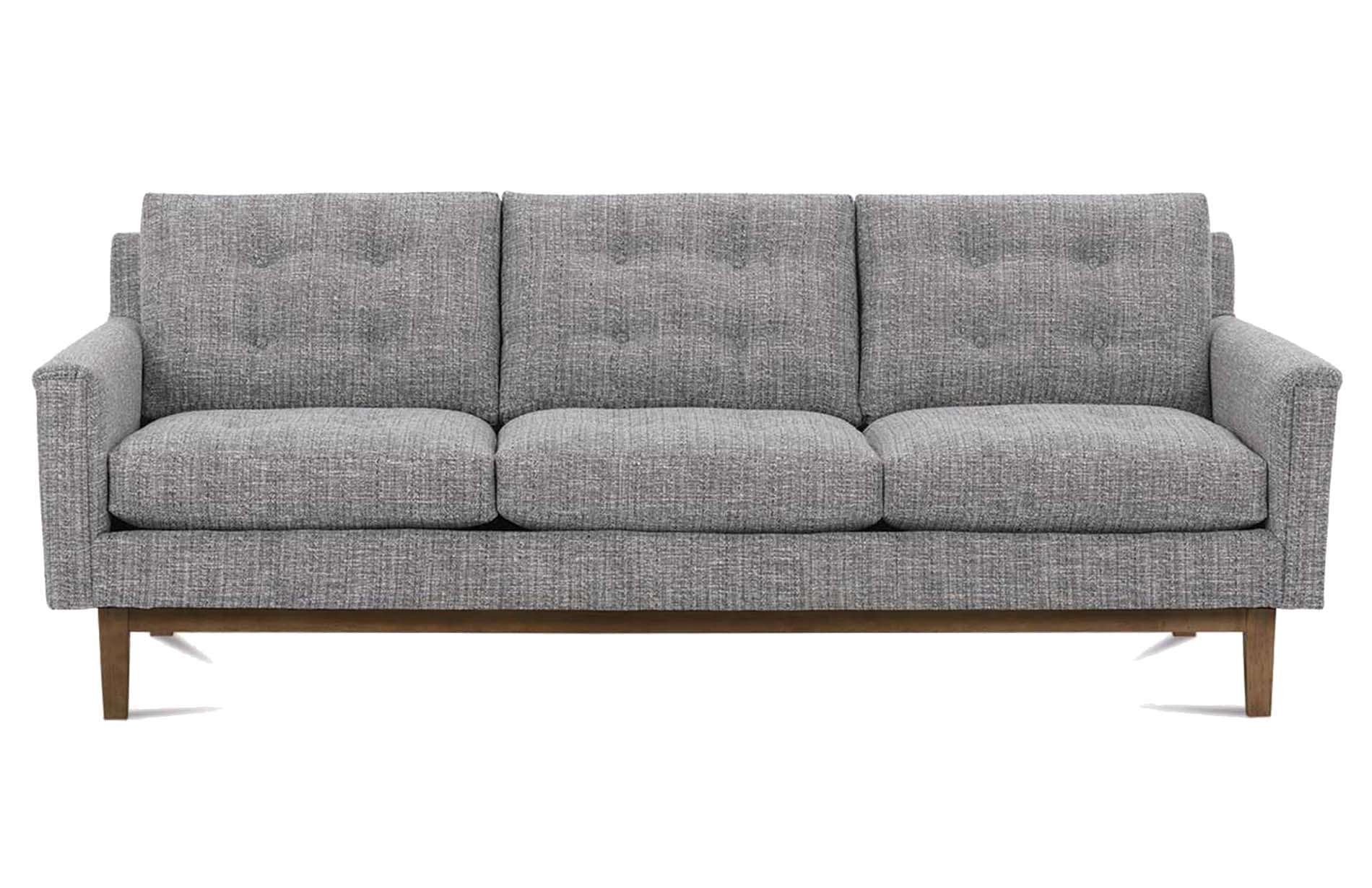 Add this mid-century modern sofa to your home for comfortable and stylish seating. The three back cushions feature simple button tufting. This sofa has exposed wood details running along the front, back and sides that accents the upholstery of the rest of the piece.86″W x 37″d x 35″H