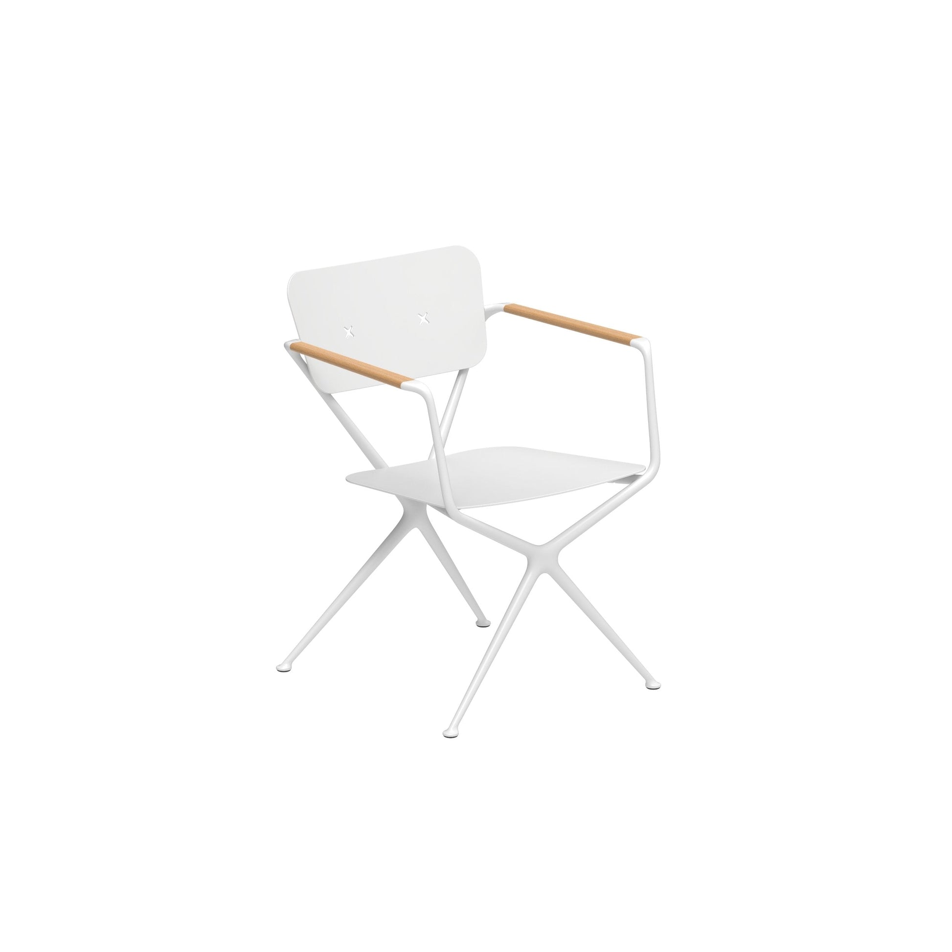 The fluent organic lines of the cast aluminum frame are only interrupted by the tapered teak armrests offering a warm design element. The seamless integrated curved backrest plate has two X-shaped openings. They not only serve as aesthetic features but also as fixation points for the backrest cushion. These are attached by means of X-shaped knobs that come standard in the color of the frame. Teak ones are also offered as an option to match the armrests. They make the Exes chair even more of an eye-catcher.