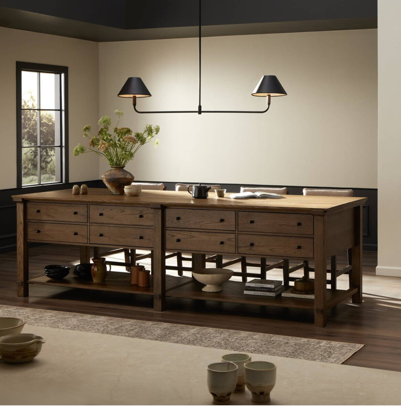 Make room for more prepping, gathering and storage. This large and functional kitchen island features eight wide drawers on one side, a large bottom shelf below and room for stools. Designed with an oak cradle frame that holds the tabletop above with exposed joint details on the shelf and legs below for a benchmade look and feel. Crafted from oak with iron accents. 118 x 43.5 x 36H