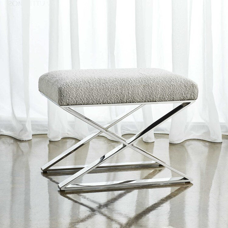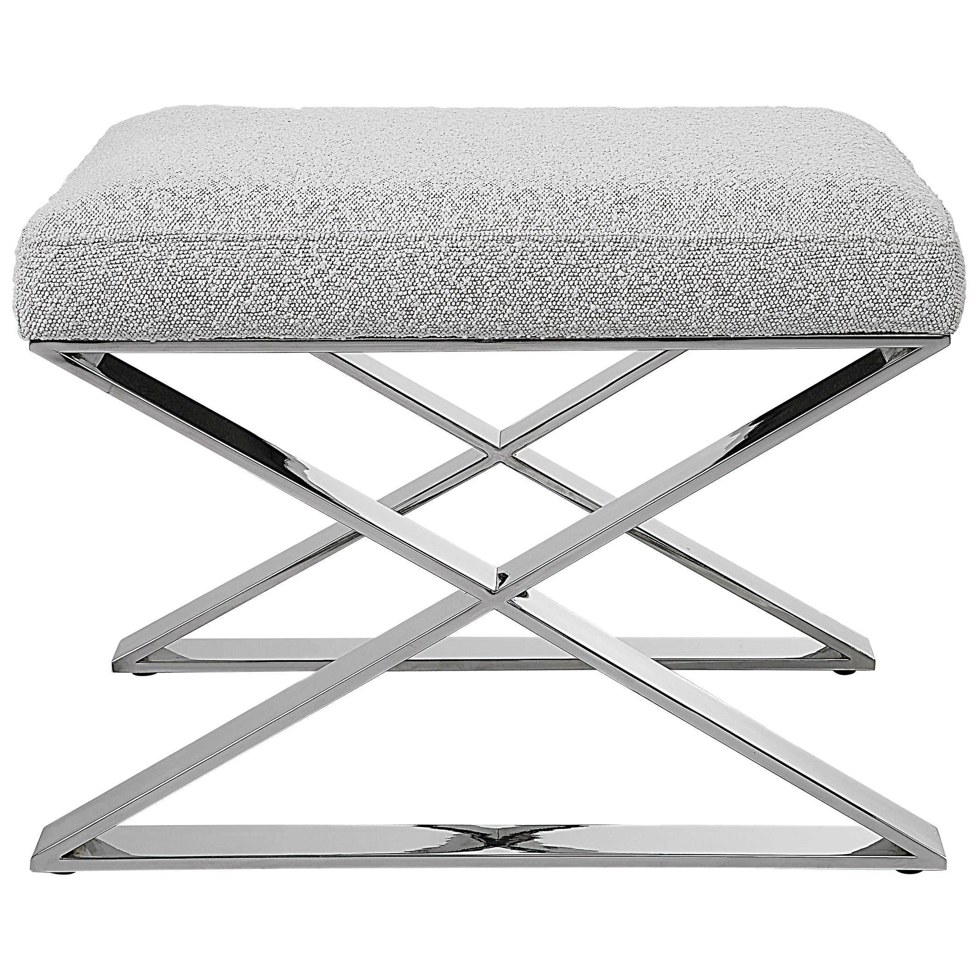 A sumptuous ivory boucle cushion rests atop this streamline steel base with polished chrome finish. The seat size is generous, yet its overall proportions are small enough to fit in a variety of locations.Dimensions: 26 W X 20 H X 18 D (in)