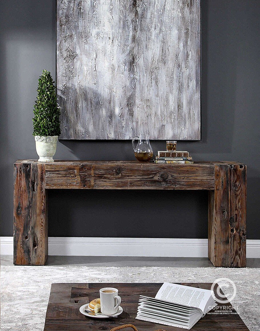 One of a kind sofa table constructed from recycled, reclaimed boat wood collected from old Chinese fishing vessels. This statement piece showcases years of use with natural wood grain texture that has subtle hints of color and hand pieced dovetail joinery. Solid wood will continue to move with temperature and humidity changes, which can result in cracks and uneven surfaces, adding to its authenticity and character.Dimensions:72 W X 32 H X 12 D (in)