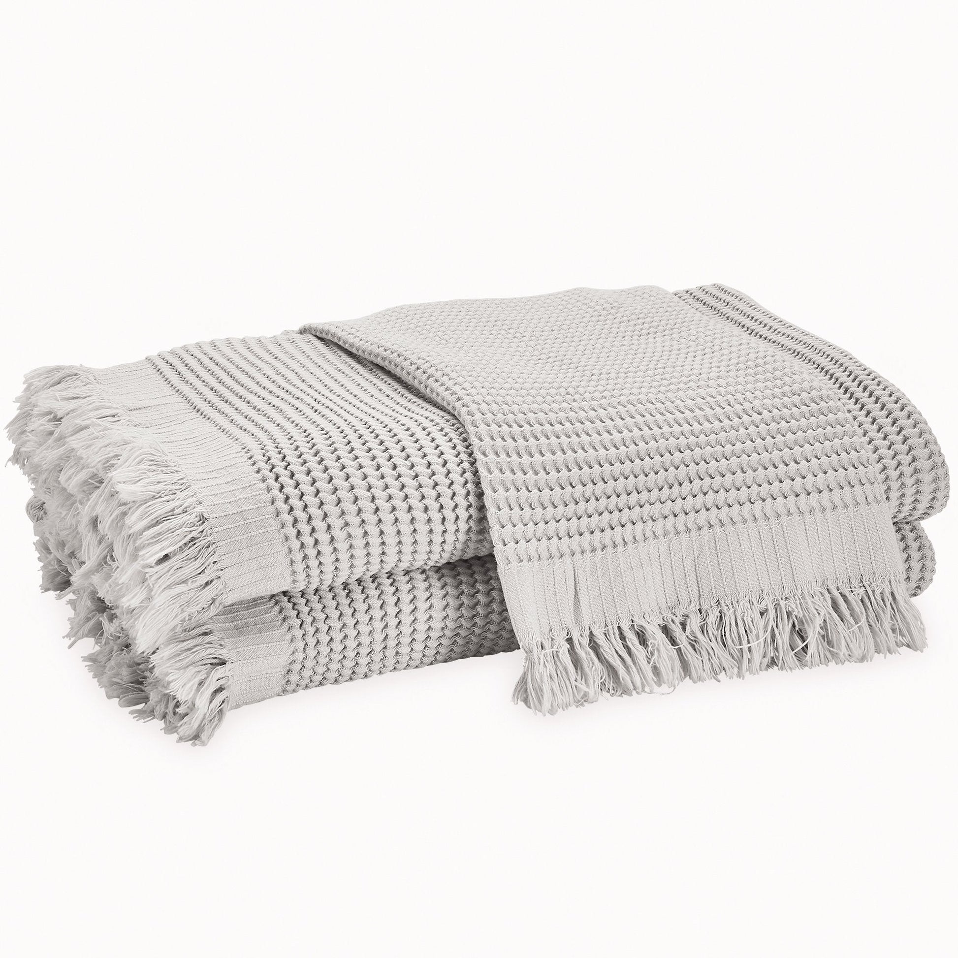 Kiran is a unique waffle towel that will beguile you with its luxuriant suppleness and thirsty texture. Woven and finished in Turkey, it owes its softness to 25% bamboo blended with cotton. A delicate barred border with fringe is a special finishing touch.Wash Cloth 13 x 13 in.Bath Towel 40 in W x 60 in LHand Towel 20 in W x 32 in L