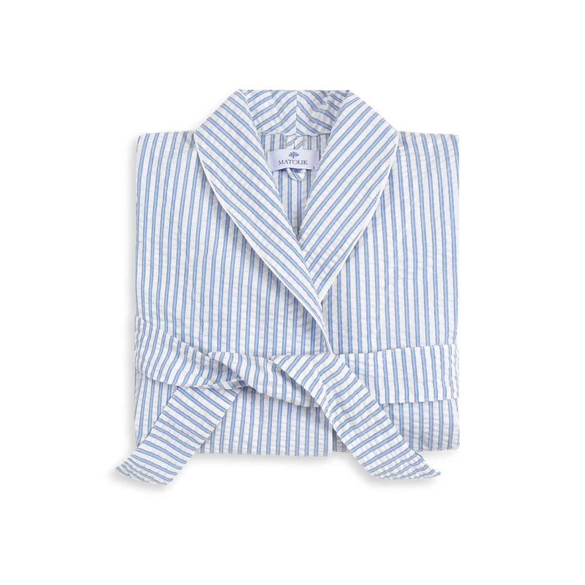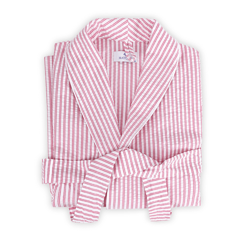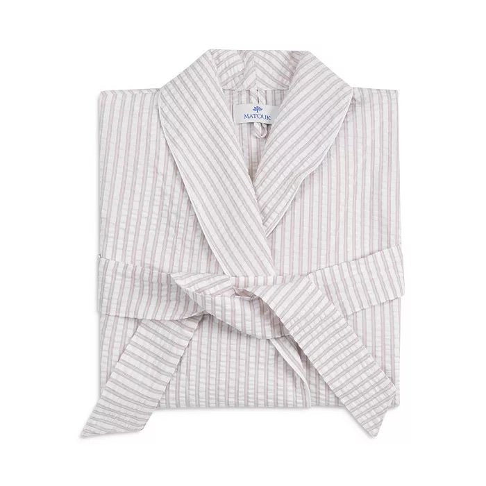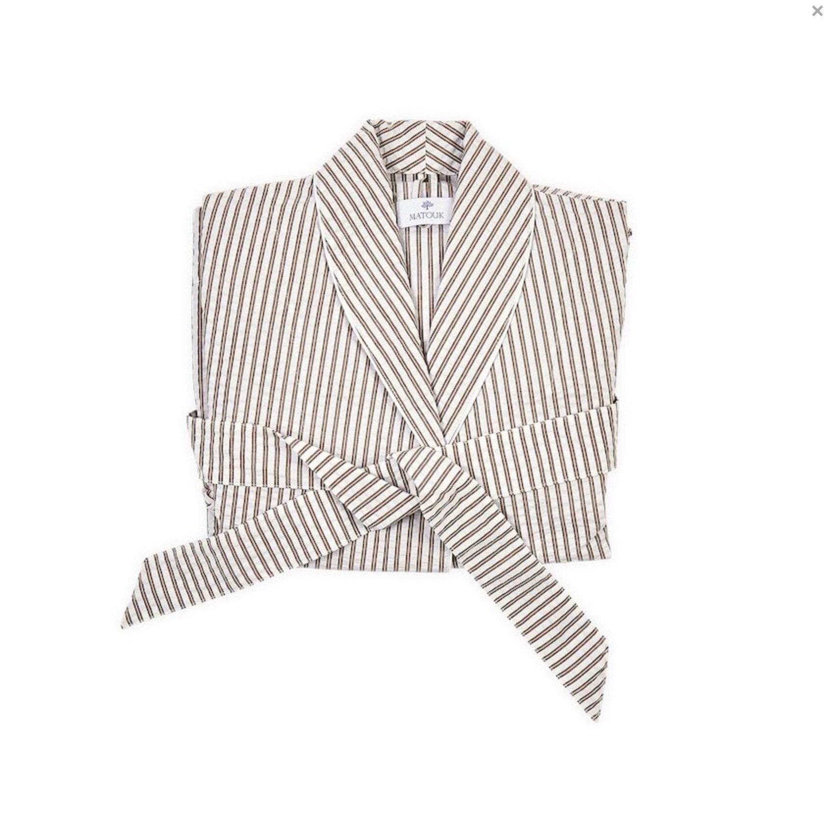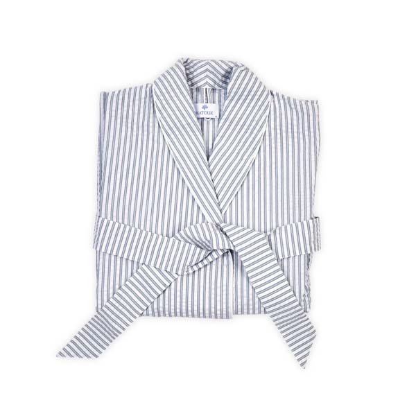 Relax in the cool, comfortable striped seersucker of Matteo Robes. The sophisticated style is reminiscent of elegant menswear. Made in the USA by Matouk.Available in Sea, Azure, Natural, Bark and Peony Sizes XS,S, M/L, XL