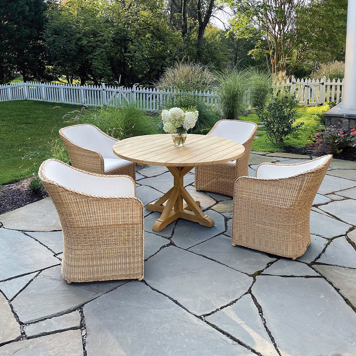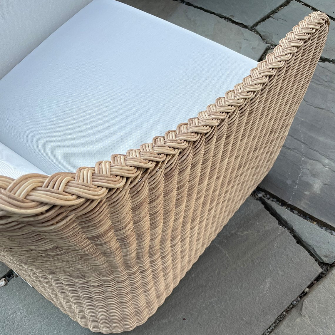 The Quogue collection combines all-weather wicker with a modern upholstered seating surface, eliminating the need for a cushion. Upholstered surfaces are made from durable, easy-to-care-for Batyline™ mesh. Seats are gently padded with quick-drying reticulated foam and typically dry in as little as 20 minutes after rainfall.
