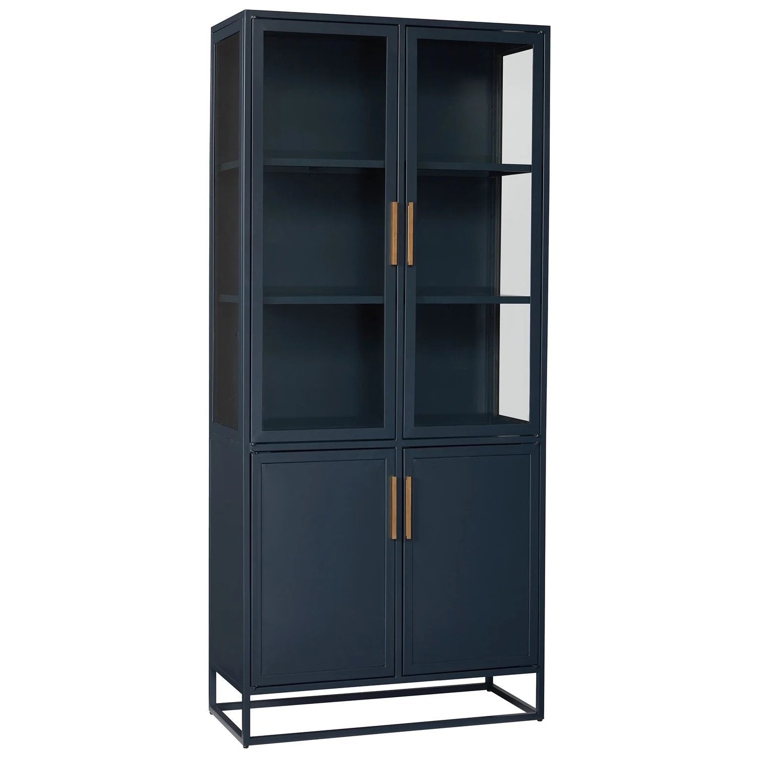 Add vertical storage to living areas with the Santorini Tall Metal Kitchen Cabinet, a serenely confident piece in a deep blue finish with clear glass doors and sleek gold bar hardware.Dimensions: 36W X 16D X 80H