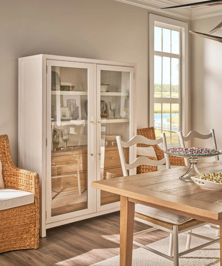 An idyllic statement piece, the Seaside Display Cabinet marries form to function with a tall body housing a mixture of drawers and open-air shelving. For an inviting finishing touch, two glass doors encase the furnishing for a fully elevated look.