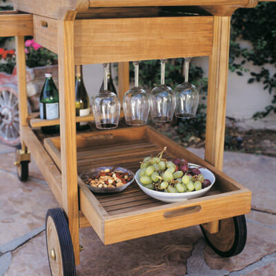 The ultimate in outdoor serving convenience and storage is yours with the Kingsley Bate Serving Cart. This cart features all the accoutrements that a seasoned host or hostess needs including storage drawers, glass and bottle racks, and a removable serving tray. There is additional surface area with the included folding table leaf. This cart is made from durable teak wood and has four teak wheels with rubber rims so that it moves easily and quietly across your patio or lanai.