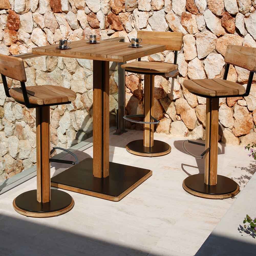 The name Titan was chosen to represent this solid, beautifully robust design with its grand dimensions. These high dining tables are uniquely styled and made from rustic teak. This teak features knots and a varied grain pattern, which is combined with a black powder-coated aluminum frame. The substantial steel bases feature height-leveling adjusters for stability on uneven surfaces.Pub Table Dimensions: 29.5 in W x 29.5 in D x 41.3 in HCounter Dimensions: 30in W x 30 in D x 36 in H
