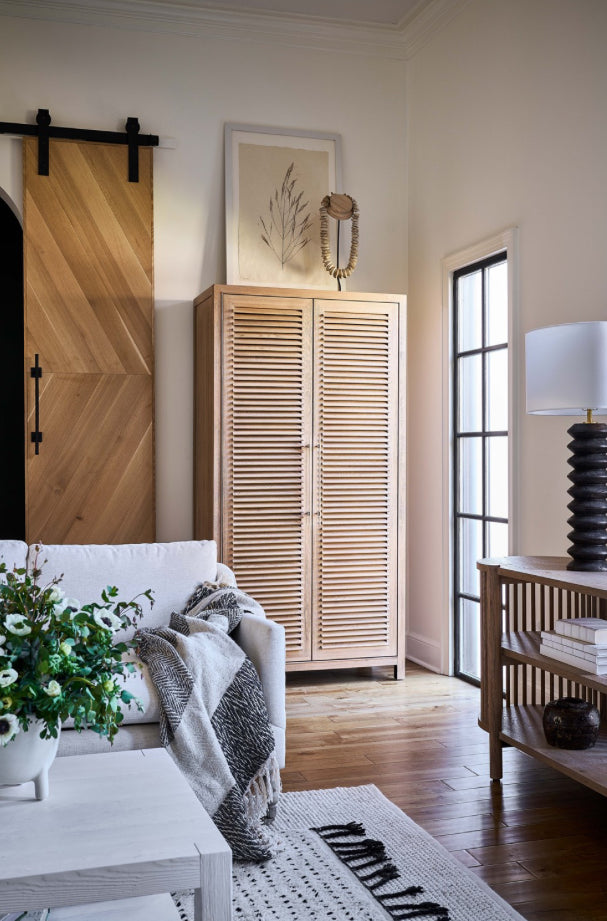 The Weekender Utility Cabinet brings the vibes of a small beach town and fuses it with charming modern detailing. With a knotty oak finish, acrylic pulls and an abundance of interior storage space, this piece is equal parts style and function.