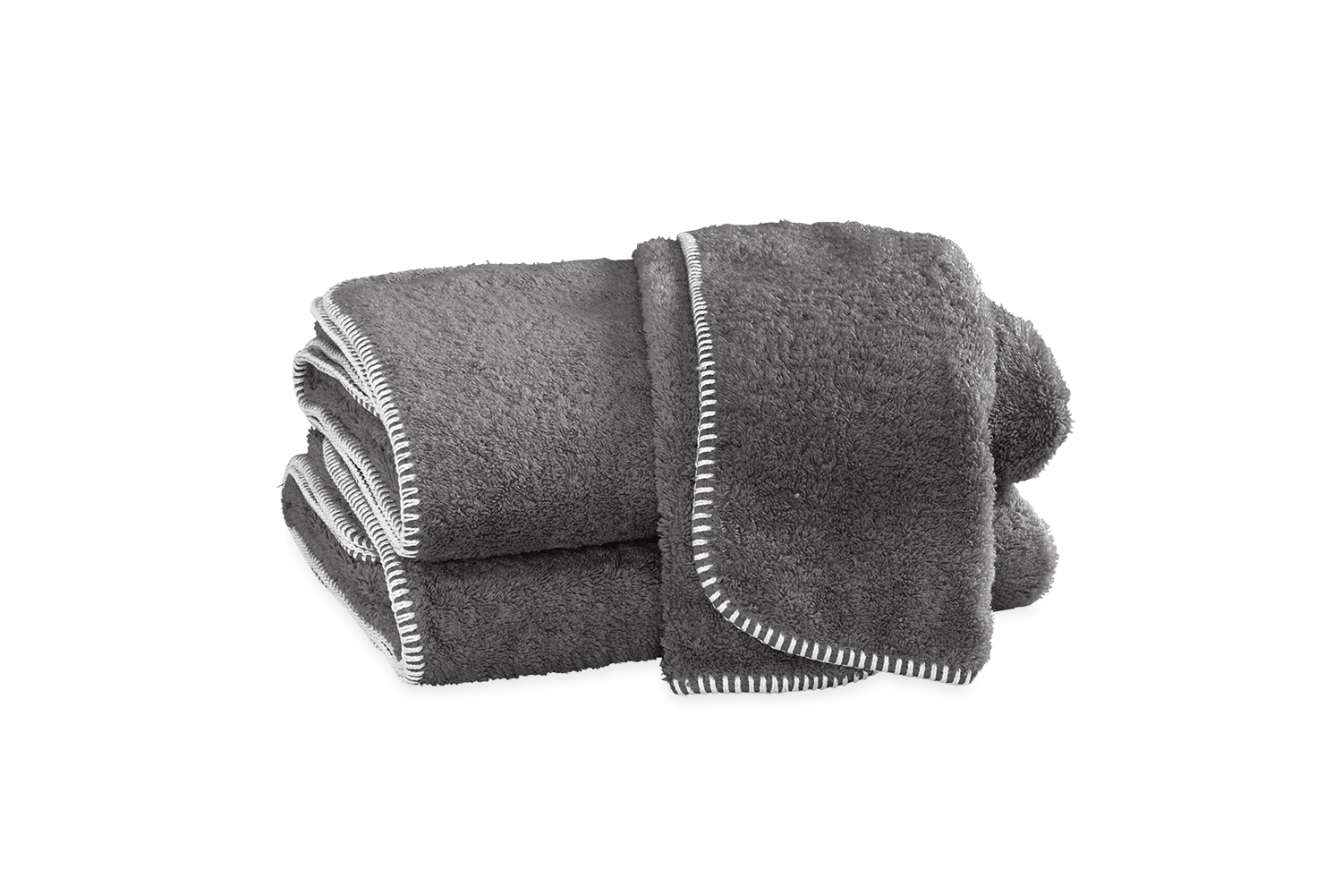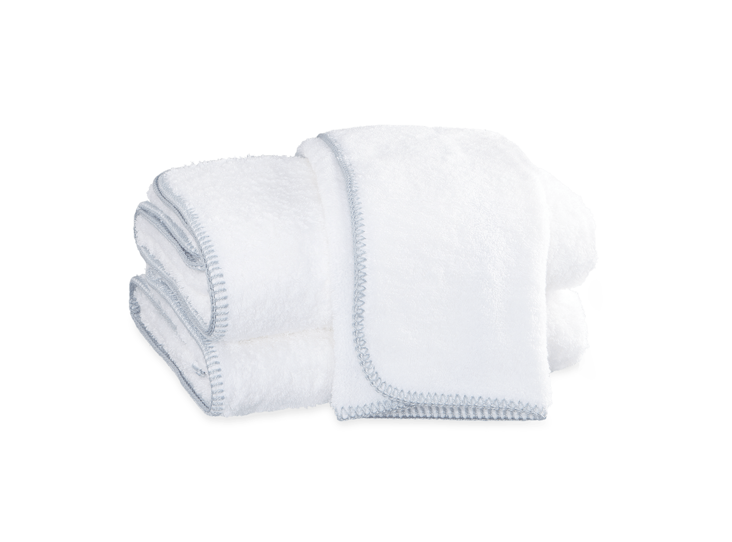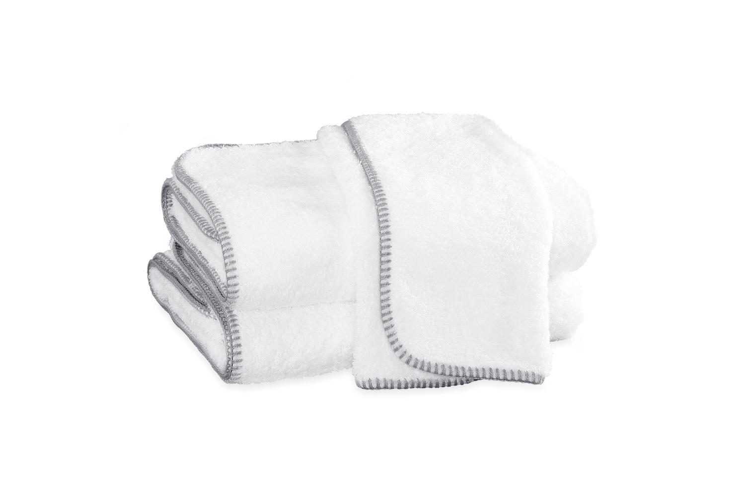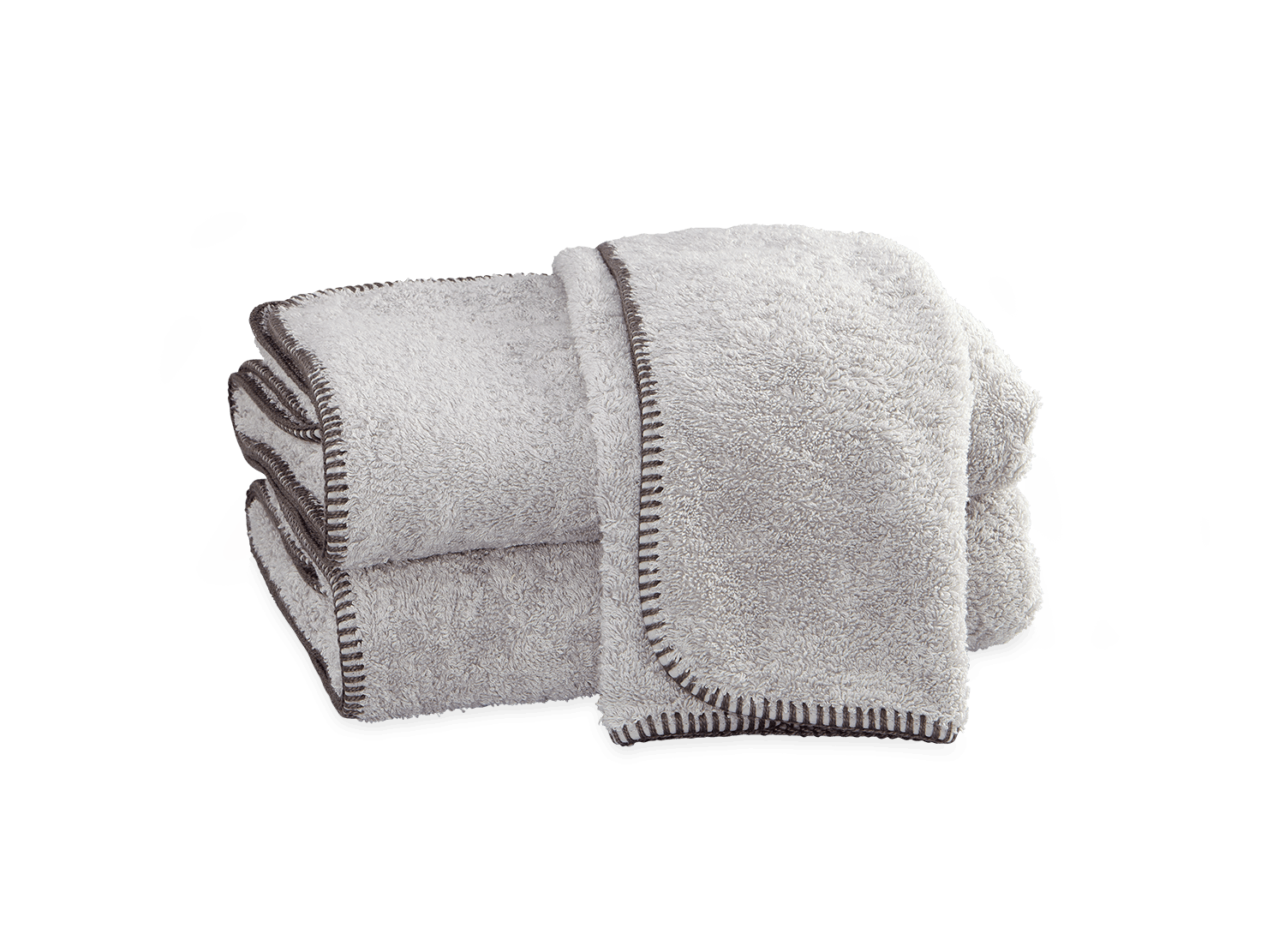 The Whipstitch collection celebrates a simple, casual style that's immediately comforting and familiar. Matouk has edged their plush Cairo long-staple cotton terry with tidy whipstitching in your choice of colorful or subtle tones.Bath Sheet 36" W x 75" LBath Towel 30" W x 52" LHand Towel 18" W x 32" LGuest Towel 14" W x 21" LWash Cloth 13" x 13" SquareAvailable in Nickel, Periwinkle, pearl/charcoal, Ivory, Sterling, White, Pink, sea/white, pool/white, smoke gray/white.